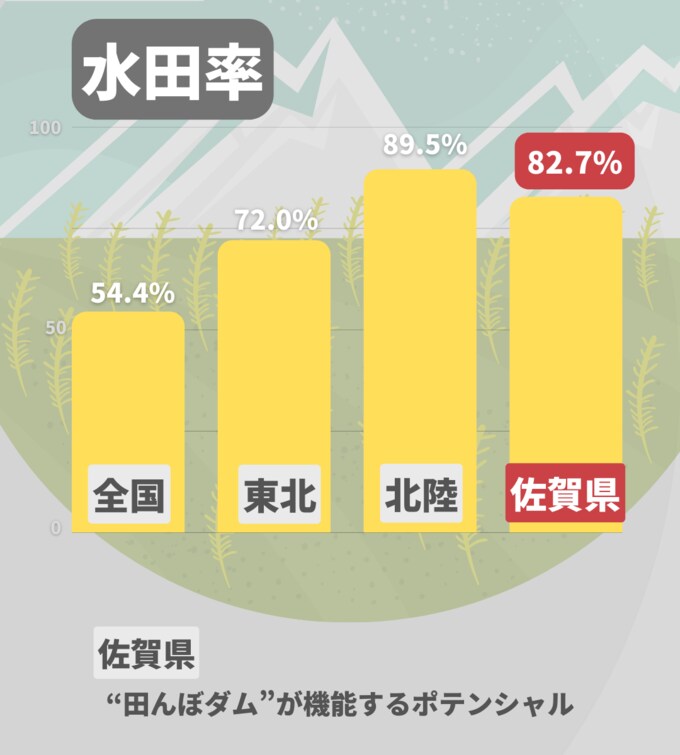 耕地面積に占める田の割合(水田率※)は、全国平均が54.4%。有数の米所を抱える東北(72.0%)や北陸(89.5%)はやはり高い。佐賀県は82.7%と田んぼダムが機能するポテンシャルは十分にある。