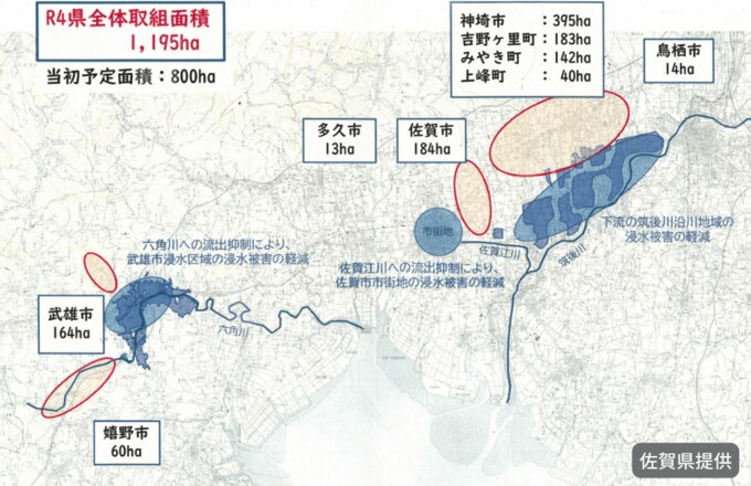 県は佐賀市や武雄市など9つの市町の約12平方キロメートルを田んぼダムの対象にしたい考えだ。貯蔵量は120万トン、小学校の25メートルプール4000杯分に相当する。