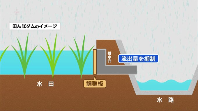 RKB岩本大志「排水溝に板をはめ、田んぼの水の流れを抑制します。そうして雨水を貯めてダムを作ります」