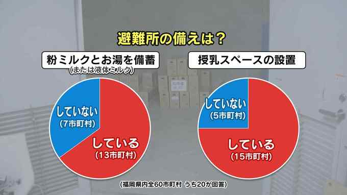 また、避難所は自宅からの物資の持ち込みを前提としているため、すべての避難所が粉ミルクやお湯などを備蓄しているとは限りません。RKBが福岡県内の市町村を調べたところ、避難所に粉ミルクとお湯の備蓄をしているのは、回答のあったうち6割ほどの市町村で、授乳スペースを備えているのは7割ほどにとどまっています(全60市町村のうち20市町村が回答)。