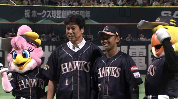26日のテーマは、ソフトバンクホークスとして初めて日本一に輝いた「2011年」。当時チームを率いたRKB野球解説者の秋山幸二さんが、試合前のセレモニアルピッチに登場しました。ボールを受けるのは、その2011年に1軍初出場を果たした今宮選手です。実は、練習やキャッチボールなど全くせずにマウンドに上がった秋山さん。見事、ストライク投球を披露! 練習なしでもこのピッチング。最後は秋山さんの現役時代の応援歌が流れるなか、今宮選手と記念撮影を行いました。