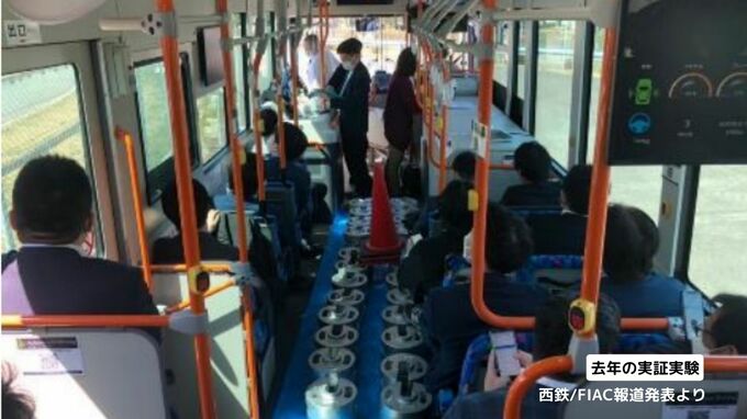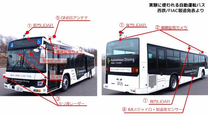 実験は西日本鉄道(西鉄)と福岡空港の運営会社・福岡国際空港が共同で行う。定員79人、座席29席のいすゞの「エルガ」を午前10時から午後9時までに8往復する。バスには、3次元地図と自車位置を照合するためのレーダー装置「LiDAR」のほか、信号の色や周辺の状況を検知するための各種カメラ、ミリ波レーダーやジャイロセンサー、GNSSアンテナなどを搭載する。