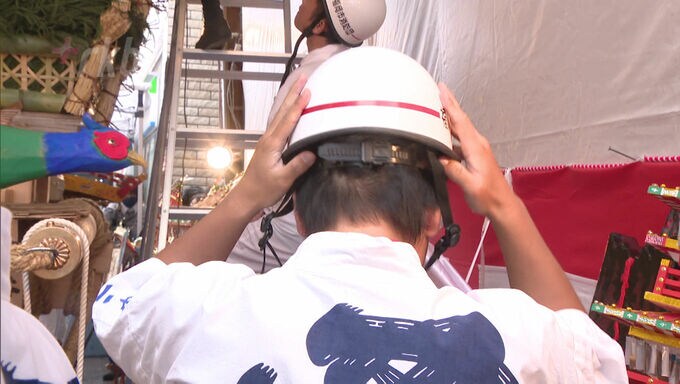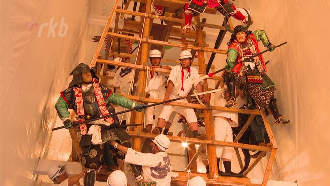 四番山笠、中洲流の飾り山笠では、作業の開始に先立って、ヘルメットをかぶることや、高所では安全帯の着用を徹底することなど、安全対策を確認しました。続いて人形師の指示のもと、約100人の男たちが、山笠大工とともに人形の飾り付けを始めました。