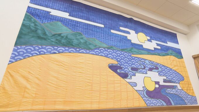 福岡市東区の九州産業大学で開かれた「八女福島の燈籠人形」背景幕の引き渡し式には、幕の制作を担当した学生や保存会の役員など10人が参加しました。九州産業大学は「八女福島の燈籠人形」保存会の要請を受け、2014年から縦3メートル、横6メートルの背景幕を制作しています。今年は、人形芝居「玉藻之前(たまものまえ)」の第2幕「河畔(かはん)の月」で使用する背景幕を贈りました。