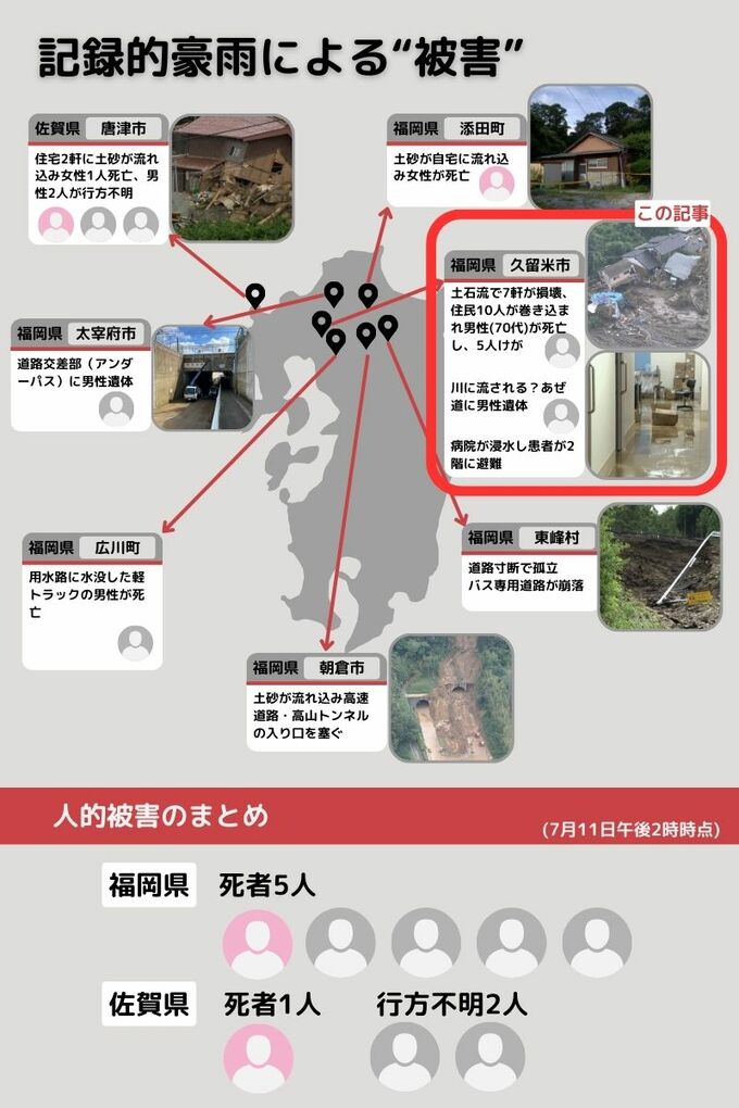 久留米市田主丸の竹野地区を10日襲った土石流。住宅7棟が損壊し、家にいた10人が巻き込まれました。心肺停止で見つかった70代の男性が死亡し、男女5人がけがをしています。一夜明け、現地には住民が呆然と立ち尽くしていました。