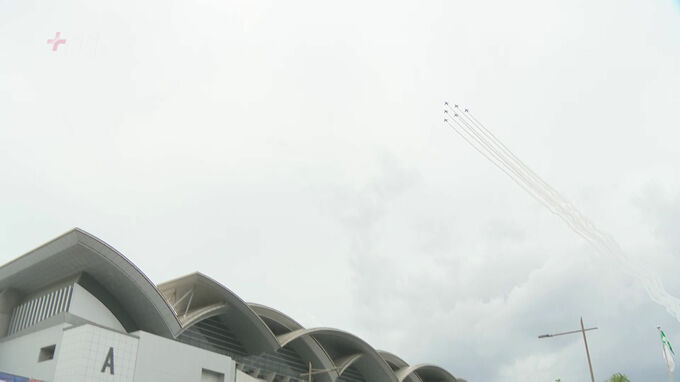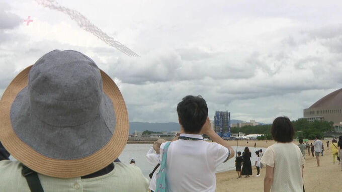 青と白にカラーリングされたブルーインパルスの6機は午後2時ごろ、博多湾の志賀島から、メイン会場のマリンメッセ福岡(博多区)、そしてJR博多駅にかけて三角形の隊形を組む「デルタ・ローパス」で駆けた。それぞれの機体からは白いスモークが放たれ、ビルが集積する福岡市中心部の上空に6つのラインが出現した。