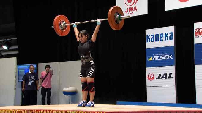 ウエイトリフティングは、バーベルを頭上まで一気に上げる「スナッチ」と、床からいったん鎖骨の位置まで上げた後で頭の上に持ち上げる「クリーン&ジャーク」の合計重量で競います。