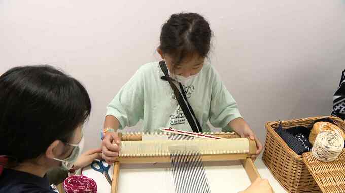 国の重要文化財に指定されている久留米絣。柄になる部分を糸で縛って藍染めした後、たて糸とよこ糸をあわせて織っていきます。約30もの工程があり、1枚の絣が完成するまでに半年ほどかかるそうです。会場には、小型の織り機もあり機織りを体験することもできます。