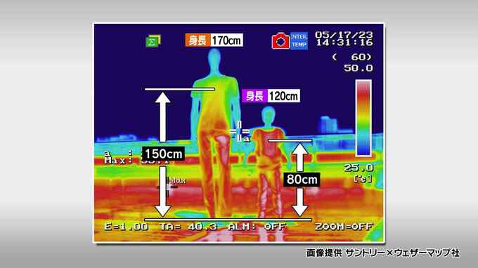 飲料メーカーのサントリーと、ウェザーマップ社が共同で行った実験。大人と子供のマネキンをサーモグラフィーを通して見た結果、表面温度が高いことを示す赤色は、大人は下半身のみだったのに対し、子供はほぼ全身に及んでいます。さらに、体感気温は大人よりも子供の方が7度も高くなりました。