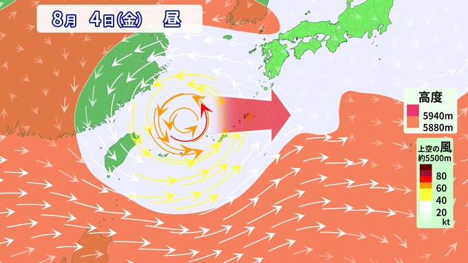 それにしても、6号の進路はUターンしたり直角に進路を変えたりと極端ですよね。このところの猛暑をもたらしている高気圧が関係しています。台風は低気圧の仲間であり、基本的に性質の違う高気圧を避ける傾向があります。高気圧が「壁」のような役割を果たし台風の進路を阻むわけです。当初、勢力が強い高気圧が日本列島を覆っていたため、台風6号は高気圧を避けるように沖縄付近を東に進みました。ところが、西から高気圧が張り出しそのまま西に進むことができなくなったため、Uターンして東に進みだします。