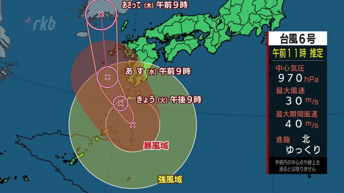 台風第6号は8日午前11時には奄美市の東北東約160キロにあって、ゆっくりした速さで北へ進んでいます。予報円の中心を進むと、台風は九州のすぐ西側を北上し、朝鮮半島に向かいます。九州北部には9日昼すぎから10日未明にかけて最も接近する見込みです。