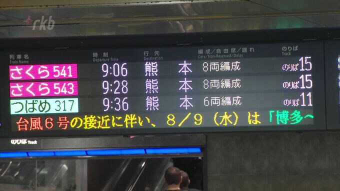 台風の接近に、伴い交通機関にも影響がでています。九州新幹線は、博多~熊本間は9日11時現在、通常運転していますが、熊本~鹿児島中央間は終日運転を見合わせています。山陽新幹線は、新大阪駅を9日午後9時14分に出発する「のぞみ197号」と午後9時23分に出発する「のぞみ59号」が広島~博多間の運転を取りやめます。10日は始発から午前8時ごろにかけ広島~小倉間の運休が決まっています。武雄温泉と長崎を結ぶ西九州新幹線は、9日午前10時以降、運転を見合わせています。在来線は、一部区間で始発から本数を減らして運転しているほかすべての区間で9日午後8時ごろから運転を見合わせる予定です。西鉄は、始発から通常運行をしていますが、9日午後3時以降に順次運行を取りやめる予定です。