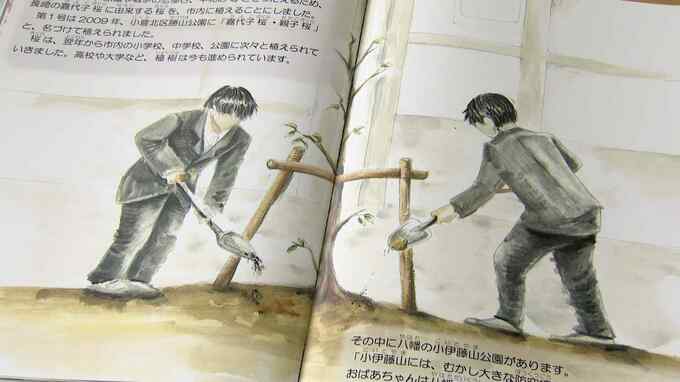 絵本は、小倉陸軍造兵廠に学徒動員されていた女性が時を経て祖母になり、孫に空襲や原爆、嘉代子桜について語っていくストーリー。