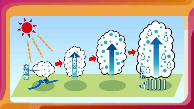 局地的な大雨は、積乱雲によって発生します。暖かい空気と冷たい空気がぶつかったり、太陽で地面が照らされたりして、強い上昇気流が発生すると雲が分厚くなり、積乱雲になります。暑い日が続くと上昇気流も強くなり、湿った空気を長い間空気中にとどめ、積乱雲がとても大きくなります。湿った空気を上昇気流で支えきれなくなると、突然大きな雨粒となり、ザーザー降りの雨が降り出します。