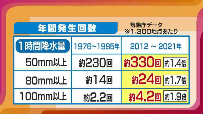 大雨が降った10年間の平均回数を分析します。まず「1時間に50ミリ以上」の大雨。1976~85年(約40年前)は約230回でしたが、2012~21年は約330回で1・4倍に増加しています。さらに、「80ミリ以上」は約14回から約24回(1・7倍)に。「100ミリ以上」も約2・2回から約4・2回(1・9倍)になっていました。