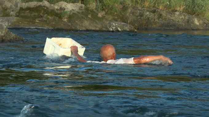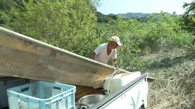 この日、八女市の最高気温は37度の猛暑日。炎天下。舟に乗り、スッポンがいそうな場所にエサを仕掛けていきます。自ら川に入って、3か所に5時間かけて100本の針を仕掛けました。