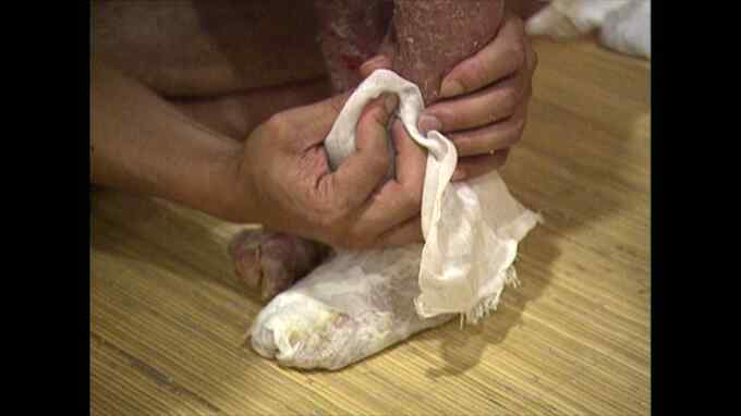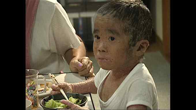 魚鱗癬は、皮膚を作る細胞の遺伝子異常によるものです。梅本遼くんは生まれてすぐ、全身に包帯が巻かれました。2001年、6歳だった遼くんがお風呂に入る様子を、カメラは撮影していました。皮膚は、常にかさぶたができている状態。包帯を取るときに、かさぶたが剥がれて強い痛みを伴いました。