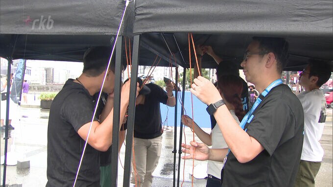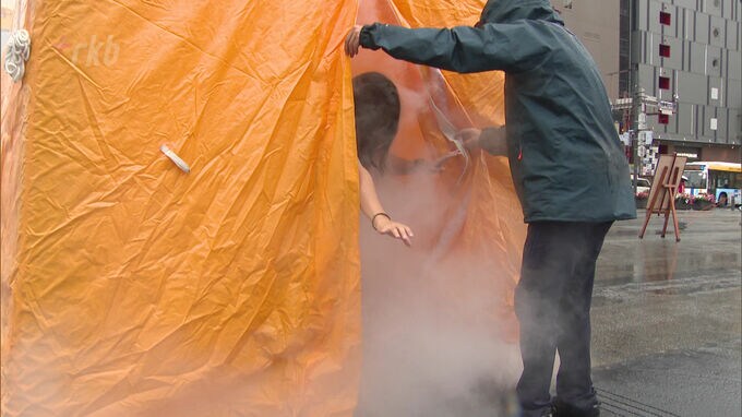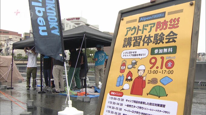 9月1日午後、福岡市中洲の「春吉橋賑わい空間」でアウトドアの知識を活用した防災講習会が開かれました。この講習会はすぐに準備できる物を使った簡易テントの作り方などを学び被災時に備えてもらおうと企画されたものです。