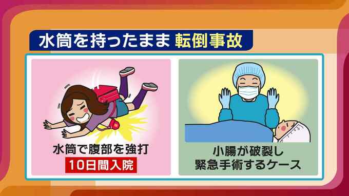 消費者庁・国民生活センターに寄せられた事例では、坂道で転倒し斜め掛けしていた水筒でお腹を強打し10日間入院したケースや、水筒の当たり所が悪くて小腸が破裂し、緊急手術をしたケースもあったといいます。
