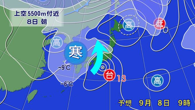 台風13号は8日(金)~9日(土)にかけて関東を直撃しそうなコースです。伊豆諸島では8日午前にかけて、線状降水帯が発生するおそれも出てきました。前日に発表された進路予想と比べ内陸よりのコースに変わっているのは、九州付近の上空にある「寒冷渦」が台風を引き寄せている可能性があります。