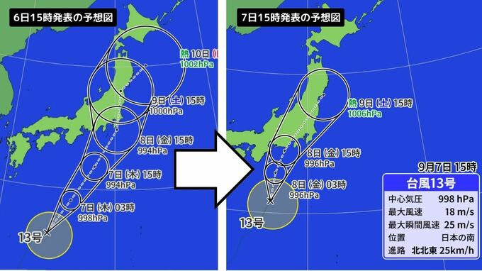 6日発表の予想からの変更点は、さらに陸地寄りの進路を取ることです。8日(金)午後3時の予報円では、台風が予報円の右側を進めば、中心が海上を通り、影響はほとんどなくなる予想でした。一方、7日の予想では、右側を通ったとしても関東に上陸する可能性が高くなっています。