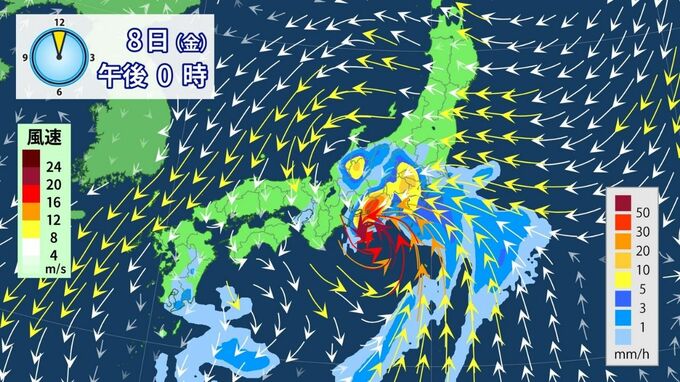 気象庁のGSMモデルによる雨と風の予想によると、8日(金)の正午ごろに、愛知県や静岡県など東海地方に上陸する見込みです。台風は進行方向の右側の風が強く“危険半円”と呼ばれています。雨雲も発達する傾向にあります。台風が東海に上陸すれば、首都圏はこの“台風の右側”にあたり、雨風が強まる可能性が高くなります。