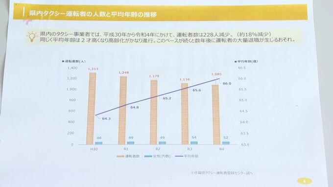 佐賀市高木瀬町で開かれた説明会には、バスやタクシー、トラックの会社から約40人が参加しました。佐賀県では、これら3業種のいずれも運転手の高齢化が進み、毎年、多くの離職者が出ています。特にタクシー業界では、2018年からの5年間で全体の2割近い228人の運転手が減少しました。