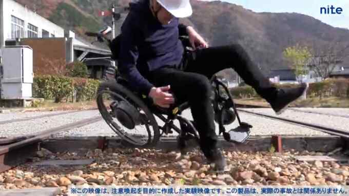 製品評価技術基盤機構 岡田大樹さん「誤った操作での事故が多く起きておりますので、広く安全な場所でまず練習を行って、電動車いすの操作や速度に十分に慣れていただきたい。走行しようとしている道路の状況、踏切とか、落ちてしまいそうな側溝、急な坂道がないかを確認して、事故を減らしていただければ」