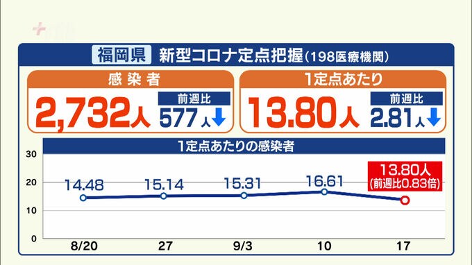 福岡県によりますと、9月11日から17日までに医療機関から報告された新型コロナの感染者は2732人で前の週より少なくなりましたが定点あたりの感染者は二桁の状態が続いています。