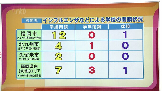 9月17日までの福岡県の定点あたりのインフルエンザの患者数は前の週の1.27倍に増え、全国の前の週の患者数の2倍以上になっています。福岡県内では、21日、あわせて36校が、学級閉鎖、学年閉鎖、休校となっています。