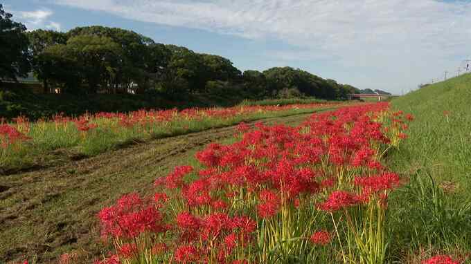 ヒガンバナが見頃を迎えているのは、福岡県八女市の矢部川の河川敷。約500メートルにわたって赤い花を咲かせています。