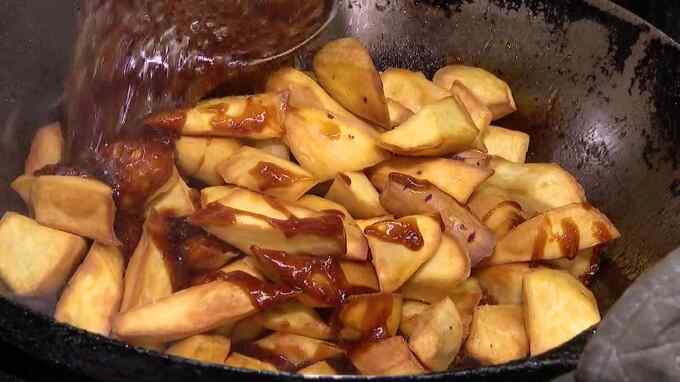 福岡県那珂川市にある食品加工工場「那珂川キッチン」 無添加・国産食材にこだわった様々な冷凍惣菜を手作りで製造しています。その中で一番人気の商品は「大学芋」 大きく育ったサツマイモを手作業で丁寧にカットして2度揚げします。国産の粗糖から手作りした甘い飴を絡めたら完成です。