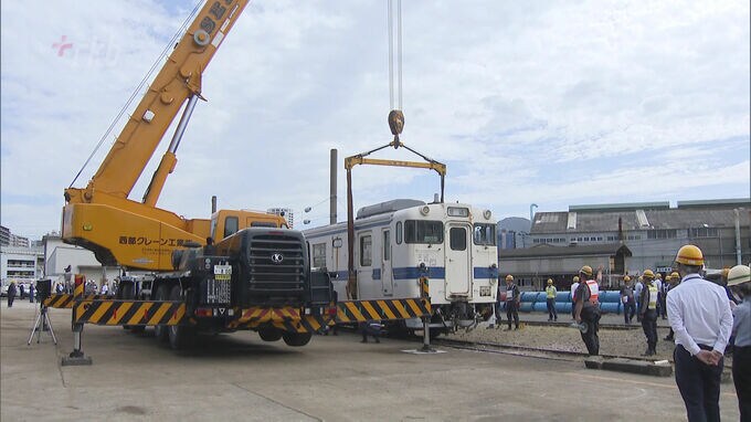 北九州市小倉北区にあるJR九州の車両センターで6日午前に行われた総合脱線復旧訓練には、JR九州や警察など約260人が参加しました。訓練は、走行中の列車が踏切で乗用車と衝突し、脱線したという想定で行われました。
