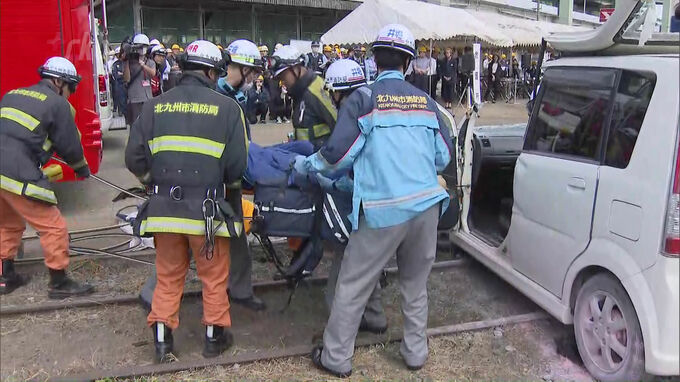 列車事故の際に迅速な対応につなげようとJR九州などが6日、走行中の列車が車と衝突して脱線したことを想定した訓練を福岡県北九州市で行いました。