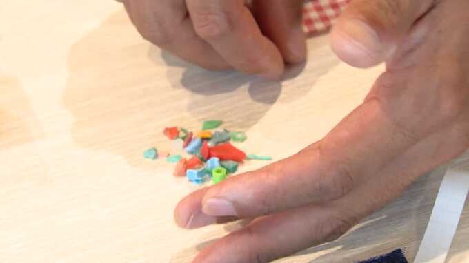 RKB高田佳明「先ほどビーチで拾い集めた、こちらのプラスチックごみ。それを使った“万華鏡”作りに挑戦しています」