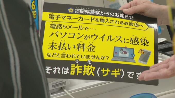 コンビニで“ニセ電話詐欺”被害を防ぐ 電子マネーカードを販売している店は最後の砦になる 2023年10月19日(木) 18:12 国内 なくならないニセ電話詐欺事件。中でも「架空請求詐欺」について、警察は「最後に被害を止めることができるのは電子マネーカードを販売している店舗だと話します。 店舗でできる「声がけ」とは。福岡市内にあるロ…