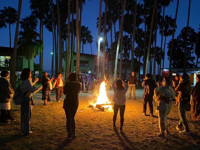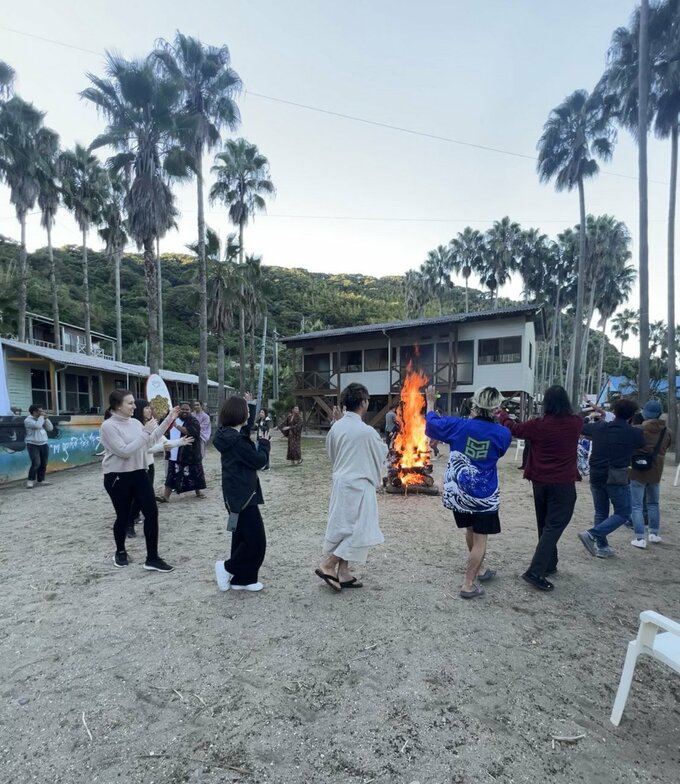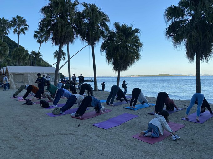 ビーチでは、参加者が砂の上でヨガを体験したり、たき火をしたり、ゆったりと穏やかな時間を過ごしていました。このイベントは、去年6月、業務委託を仲介する企業「ランサーズ」と能古島の住民が「島の活性化」について協議し生まれたもので、フリーランスの人たちが中心となって準備を進めてきました。