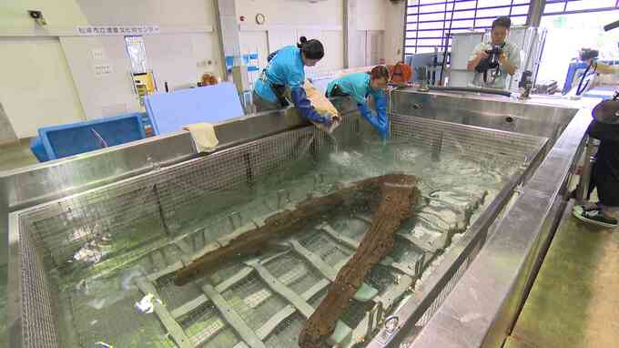 遺物を保存する技術の研究は進んでいます。水槽に浸けられているのは元寇の船の碇です。去年10月に引き揚げられたもので、約1年半におよぶ塩分を取り除く処理がこの夏終わり、糖類の一種トレハロースをしみこませて木材を補強する作業が進んでいます。トレハロースを使うことで、従来の方法よりも時間を短縮できるうえに、湿度や温度を管理しやすくなります。将来の元寇船の引き揚げも見据えた作業ですが、肝心の問題が解決されていません。