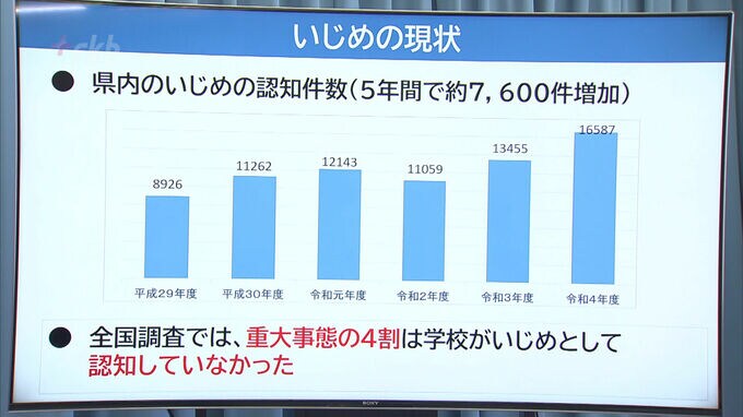 「福岡県いじめレスキューセンター」は、子供や保護者が学校への相談を迷ういじめや第三者による支援を希望するいじめに対し、社会福祉士などが第三者の立場から相談に応じ学校との調整などを行うものです。福岡県内のいじめの認知件数は2022年度に1万6587件と5年間でおよそ7600件増加しています。