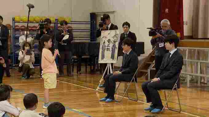 このあと、児童からは寄せ書きと手作りの将棋セットが2人からはサイン色紙がそれぞれ贈られました。