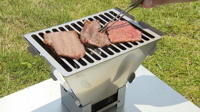 ステンレス板を組み立て、小型ポケットストーブの上に載せると焼き肉グリルになるというものです。