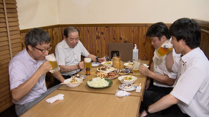 地元の焼き鳥屋に集合します。ソロキャンプに特化したキャンプギアをつくることも、ここで決まりました。
