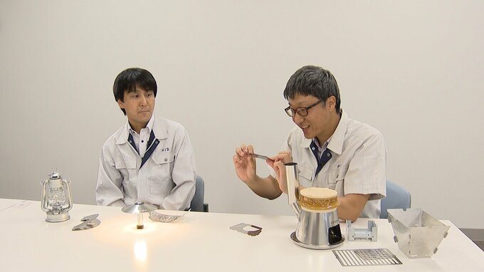 薄くて軽いキャンプギア作りが身上の竹口さんと半田さん。ついにわずか3枚のステンレス板からなる、名刺サイズの「エアストーブ」を開発しました。1人分のカップ麺に必要なお湯が沸かせます。現在は、キャンパーご用達のステンレスマグカップに収まる「固形燃料用 風防兼五徳」なるニッチな商品も開発中だということです。