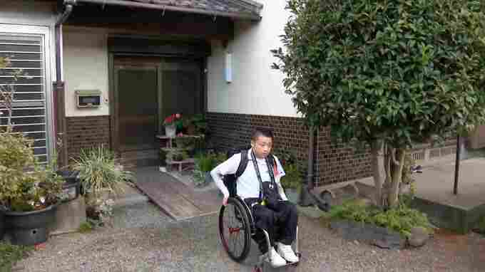 自宅から車いすで出てきたのは草場龍治さん。草場さんは、手足の筋力や感覚が徐々に低下する国指定の難病“シャルコー・マリー・トゥース病”を患い、6年前から車いす生活を送っています。