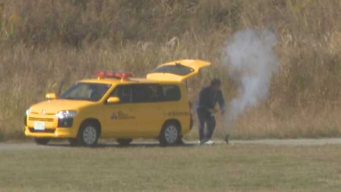 現在行っているバードストライクの主な対策は、「鳥を滑走路から遠ざける」こと。敷地内をパトロールする黄色い車がいました。鳥の姿を見つけると、“打ち上げ花火”のようなものを地面にセット。すると大きな音と白煙が上がりました。空砲で驚かせ、滑走路から遠くに行くよう仕向けているのです。