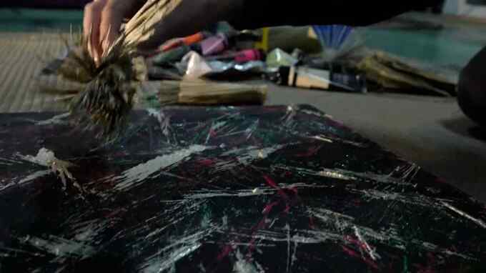 徳田さんのアートも表現の対象は「畳」から揺るがない。鮮やかな色彩の抽象画が中心で、筆ではなく張り替えで出た畳の原料「い草」の切れ端を用いる。