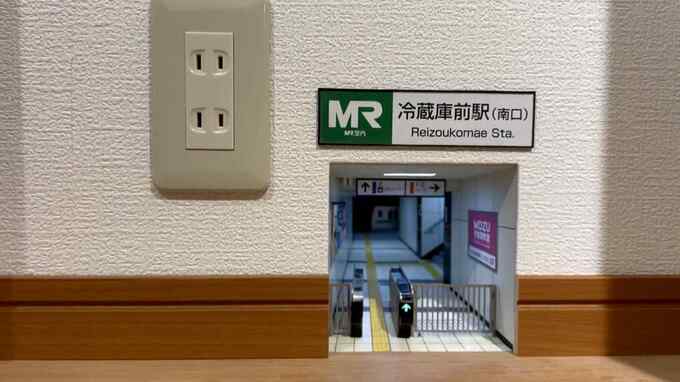 こちらは地下鉄の駅。コンセントの横に作られたこの駅の名前は冷蔵庫前駅。まさに冷蔵庫の横に作られました。