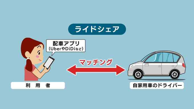 「Uber」や「DiDi」などスマートフォンのアプリを使って一般ドライバーと利用者をマッチングするサービスで、アメリカや中国など海外では普及していますが、日本では「白タク行為」として禁止されていて、過疎地など特定地域でのみ認めれています。