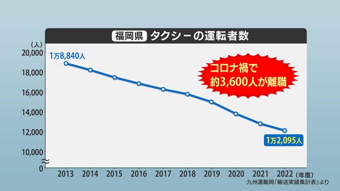 九州運輸局によりますと、福岡県のタクシー運転手は年々、減っていて、特にコロナ禍の間に約3600人が離職し、昨年度末には1万2095人となりました。