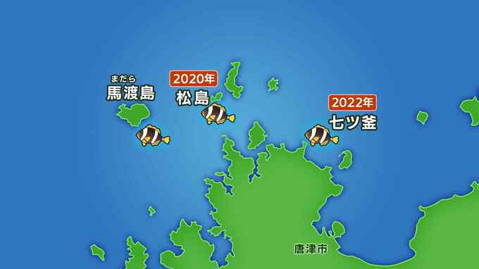 唐津市沖でクマノミが最初に見つかったのは馬渡島。対馬暖流に乗るように隣の松島でも見られるようになり、ついに去年、本土側の七ツ釜まで生息域を拡大したのです。